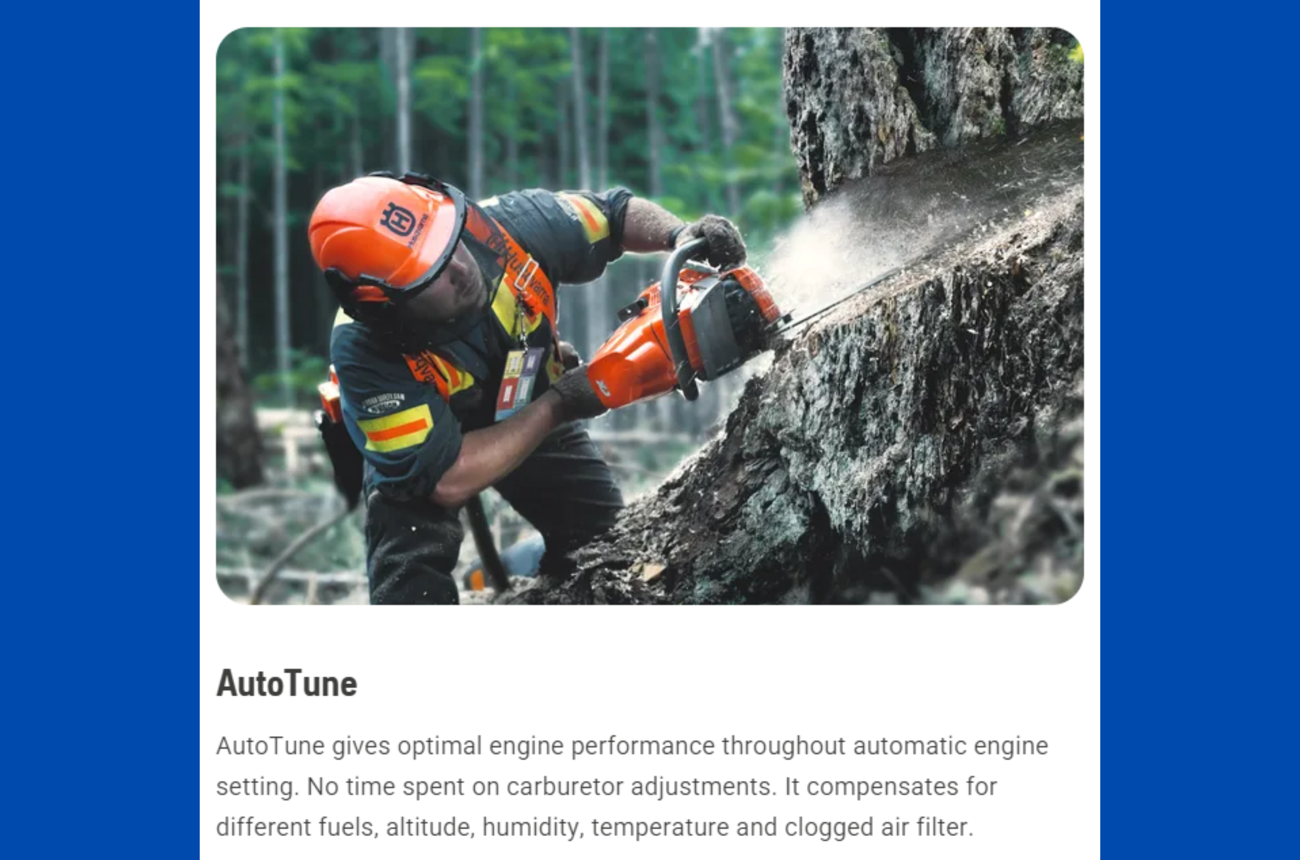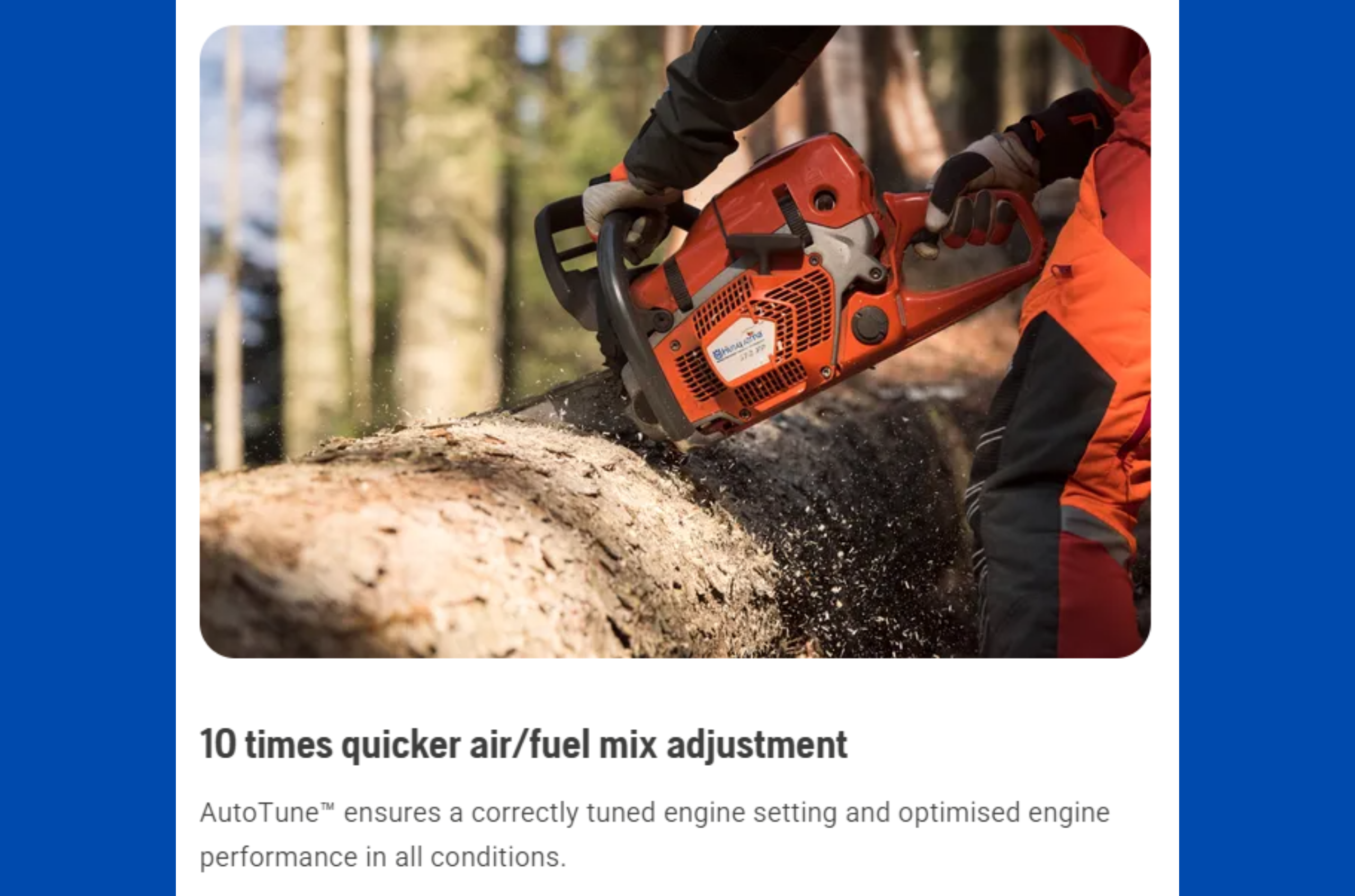 Tested in the world’s most rugged environments, the Husqvarna 572 XP® is ready for demanding work by forestry and tree care professionals. At just 14.5 lbs, the 572 XP® has a better power-to-weight ratio and 12% higher cutting capacity than previous Husqvarna models in the same class. Excellent cooling and heavy-duty filtration maximize reliability, while a smart design accommodates longer guide bars. Thanks to AutoTune™, Air Injection™ and low vibration technology, the 572 XP® empowers you to work all day. Get ready to cut faster, longer and better than ever with the 572 XP®.
